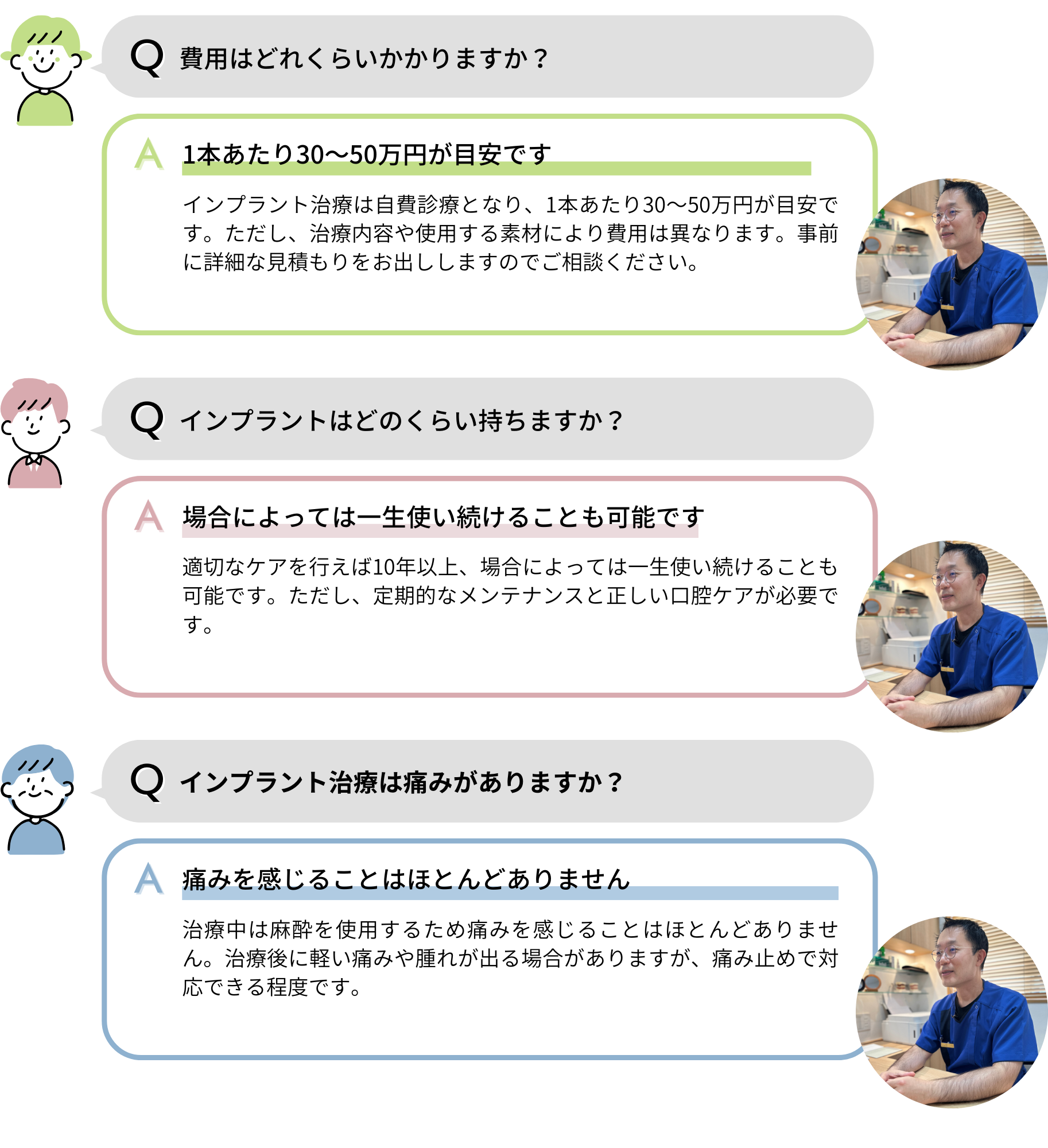 当院は、インプラントを”勧める医院”ではなく、患者様の希望や悩みをしっかり伺い、一緒に考える医院です。「どの方法が自分に合っているか分からない」という段階でも、まずはご相談ください。