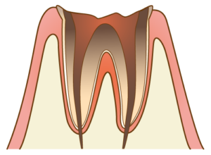 虫歯がさらに進行し、歯の上の部分がほとんど溶けて根だけが残っている状態です。神経はすでに死んでしまっているため痛みを感じないこともありますが、根の中では感染が広がり、膿がたまるなどの症状が出ることもあります。